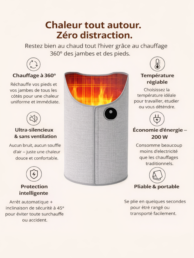 Le froid aux jambes vous ralentit et vous fatigue. Ce chauffage enveloppe vos jambes d’une chaleur douce et constante, pour que vous restiez concentré, détendu et confortable pendant que vous travaillez, lisez ou vous reposez — une chaleur qui soutient votre journée au lieu de l’interrompre.