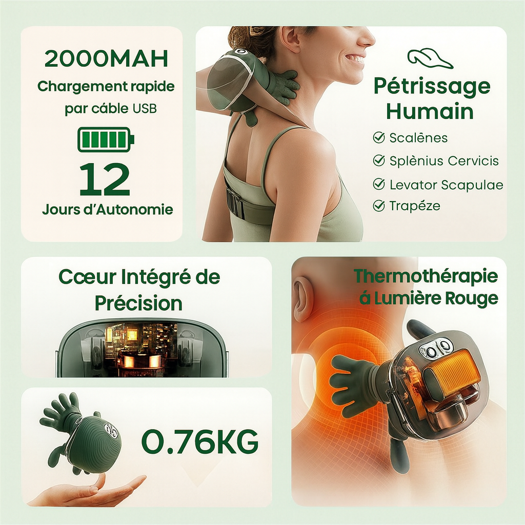 Le massageur imite de vraies mains avec 4 doigts pour le cou et un pouce pour les trapèzes. Il pétrit et soulage les tensions tout en procurant un massage relaxant. Il peut également être utilisé sur d’autres zones du corps comme les cuisses, mollets ou triceps.